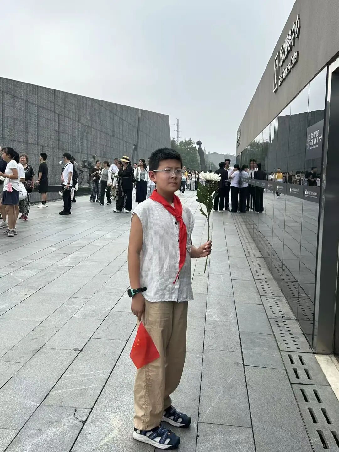 安徽黄山小观众颜予特地穿着校服,佩戴红领巾前来参观。她的哥哥在驻宁某部队服役。国庆假期,妈妈和哥哥带她来纪念馆参观学习。妈妈说:“现在的和平来之不易,希望通过参观,让孩子了解中国曾经历过的苦难历史,珍惜现在的美好生活。”
