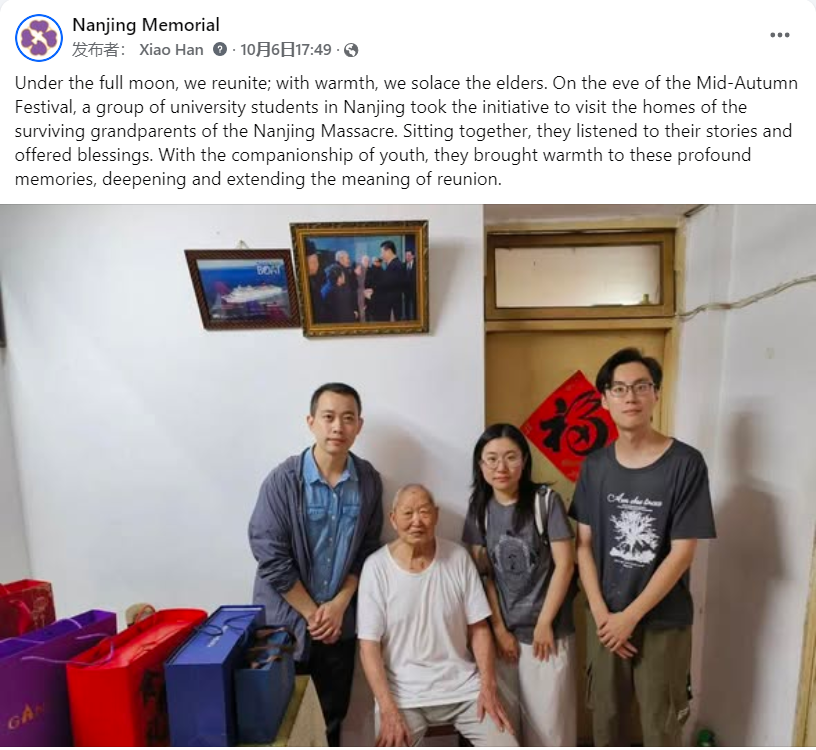 中秋节和重阳节前夕,我馆工作人员和志愿者慰问南京大屠杀幸存者,重阳节我馆为百岁幸存者老人举办生日宴。