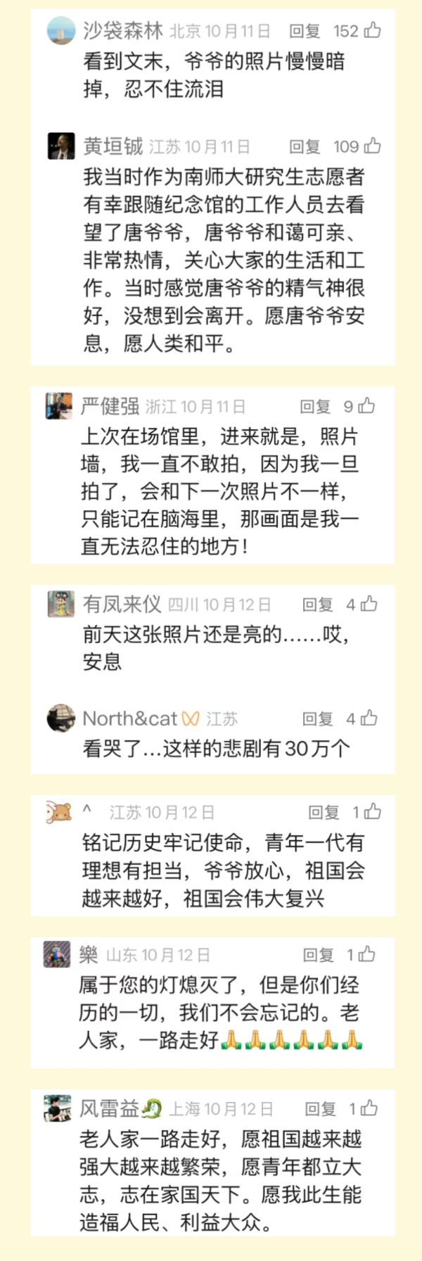 10月11日,南京大屠杀幸存者唐复龙离世,世间再看不到他侍弄花草的身影,网友纷纷留言送别这位坚强的老人。