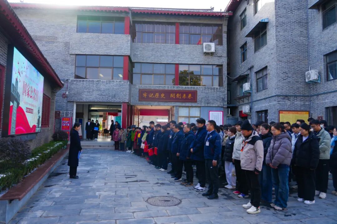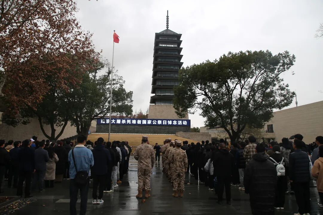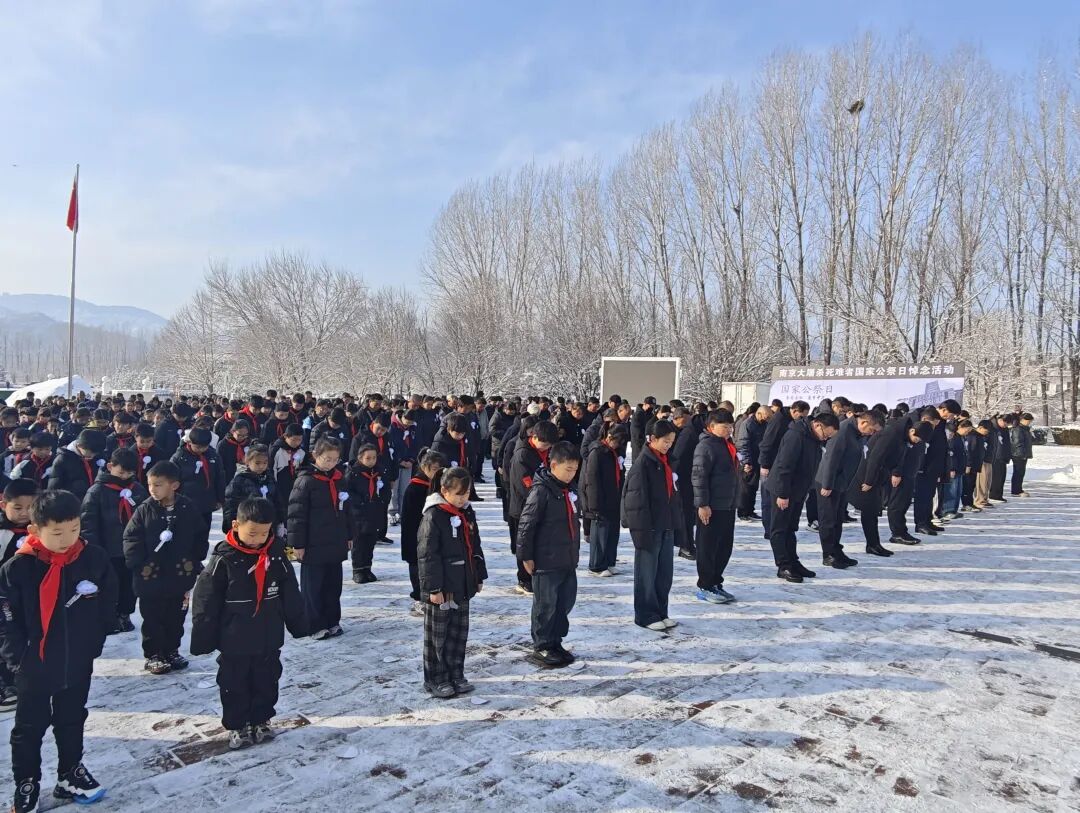 陕西延安。全体在场人员整齐列队,鲜艳的五星红旗在国歌声中缓缓升起,随着防空警报声的响起,在场人员怀着沉痛的心情低头默哀,向南京大屠杀遇难同胞致以最深切的哀悼。接着,纪念馆讲解员饱含悲愤与崇敬之情,朗诵《铭记历史 勿忘国殇》纪念文稿,字字铿锵,既倾诉着对遇难同胞的追思,更传递出以史为鉴、砥砺前行的坚定信念。