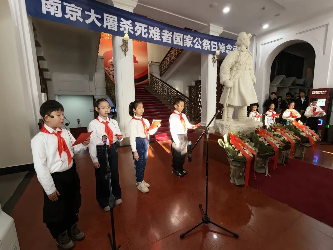 甘肃兰州。悼念活动在庄严的国歌声中正式开始,全体人员为南京大屠杀遇难同胞默哀。纪念馆讲解员深情朗诵的诗歌《南京大屠杀·公祭》和学生代表的发言,表达了对抗战英烈和死难者同胞的无限哀思及新时期少年不忘历史、立志成才、强国有我的信心和决心。随后,全体人员共同参观《人类的浩劫:1937南京大屠杀》史实展和八路军兰州办事处纪念馆。
