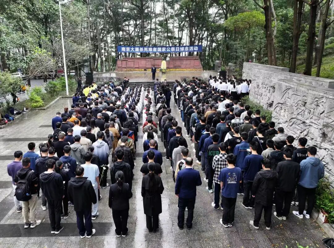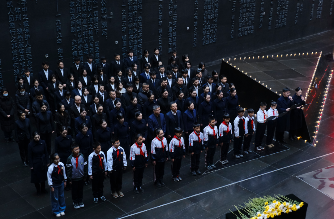 广东东莞。广东东江纵队纪念馆在纪念馆前广场举行南京大屠杀死难者国家公祭日同步悼念活动,形成了跨越时空的历史共鸣。来自粤港澳大湾区的党员代表、大学生、小学生及社会各界人士共400余人手持菊花,整齐肃立,共同参与这场缅怀历史、祈愿和平的仪式。东莞城市学院的学生代表诵读《和平宣言》,各界代表缓步走向题字碑墙,敬献鲜花。仪式结束后,全体人员参观基本陈列“东江铁流 南粤旌旗”。