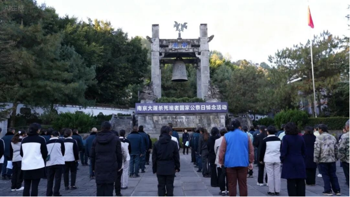 云南腾冲。滇西抗战纪念馆警钟广场庄严肃穆,活动在雄壮的国歌声中开始,全体人员肃立默哀,表达对死难同胞的深切哀思以及对抗日先烈的缅怀。大家依次向英烈敬献菊花,并鞠躬致敬。活动现场,大家集体朗诵《南京大屠杀死难者国家公祭鼎铭文》,传递对历史的铭记、对和平的珍视。