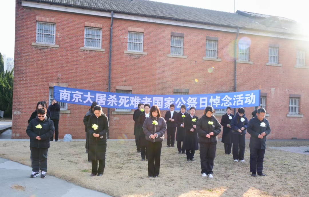 河南洛阳。八路军驻洛办事处纪念馆在南院党旗前举行南京大屠杀死难者国家公祭日悼念活动。全体人员高唱国歌,向死难者默哀、献花。志愿者代表朗诵抗战主题诗歌《烽烟的年轮》,回顾苦难岁月,铭记历史,展望未来。
