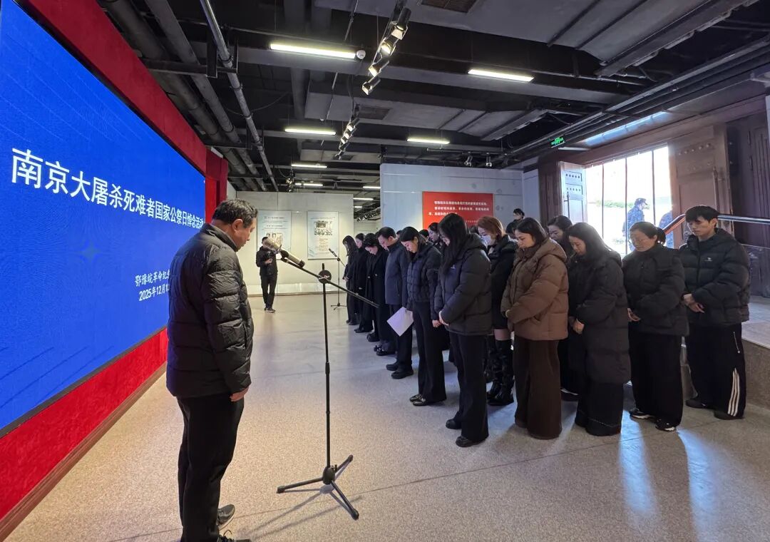 河南信阳。鄂豫皖革命纪念馆举行同步悼念活动。纪念馆全体职工共唱国歌,向死难同胞默哀。活动现场,讲解员代表朗诵纪念诗歌《民族的记忆》,以铿锵之声传递对历史的铭记、对和平的呼唤。12月12日,鄂豫皖革命纪念馆讲解员走进信阳市羊山外国语小学,以《人类的浩劫:1937南京大屠杀》图片展为内容,向师生们讲述了日军的残暴行径到中国军民的顽强抵抗,每一个细节都深深触动着师生们的心灵。