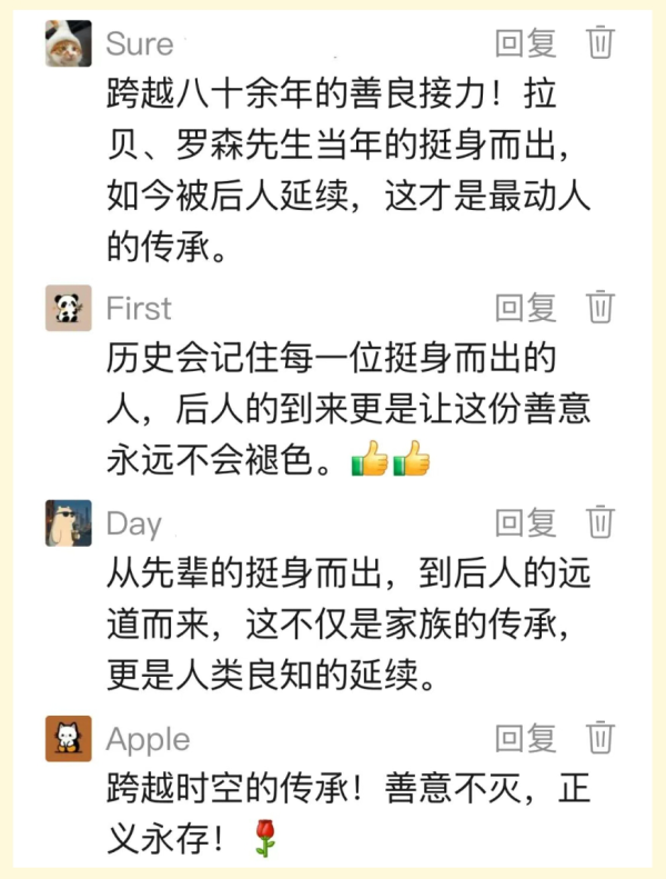 80多年前,约翰·拉贝、弗里德里希·罗森等国际义士挺身而出;80多年后,拉贝和罗森后人来到南京,将善良、勇敢和正义传递下去。