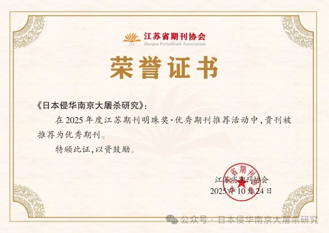 2025年5月,《国家哲学社会科学文献中心最受欢迎期刊报告(2024年度)》在京发布,《日本侵华南京大屠杀研究》杂志获“历史学最受欢迎期刊”(共五种)。