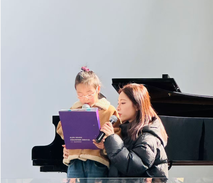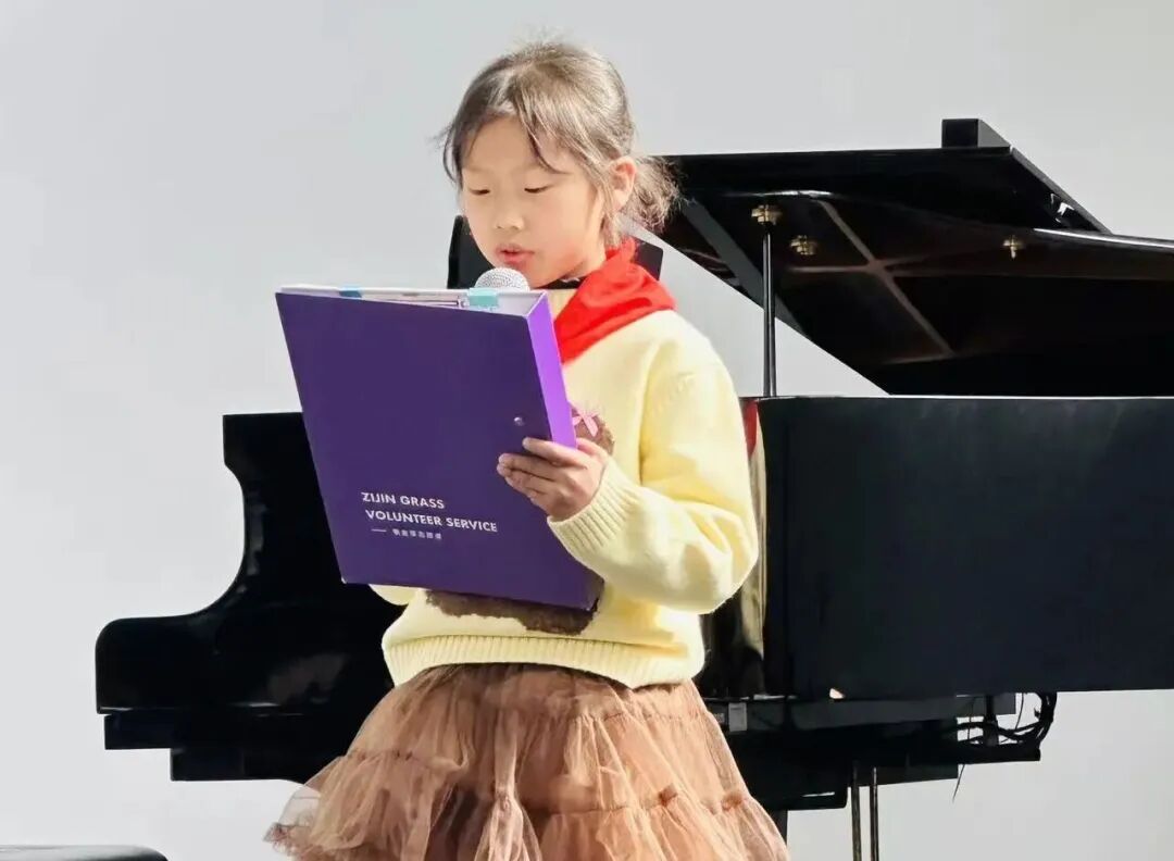 今天“和平之声”展演活动的过程中,在志愿者的带领下,很多观众也自愿上台,参与主题诗歌朗诵。其中,来自江西的8岁小朋友朱璟玟主动上台,朗诵了诗歌《紫金草》。“战争真的很可怕,我们一定要爱护和平,还要铭记历史。”虽然年纪小,但朱璟玟的发言却格外有力,她用自己稚嫩的童声,表达出了对历史的敬畏和对和平的向往。