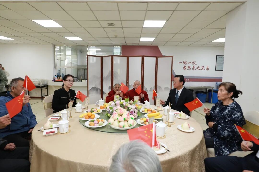 孩子们围拢过来,和老人一同在寿桃上描画“寿”字,祝愿老人福寿绵长、安康幸福。