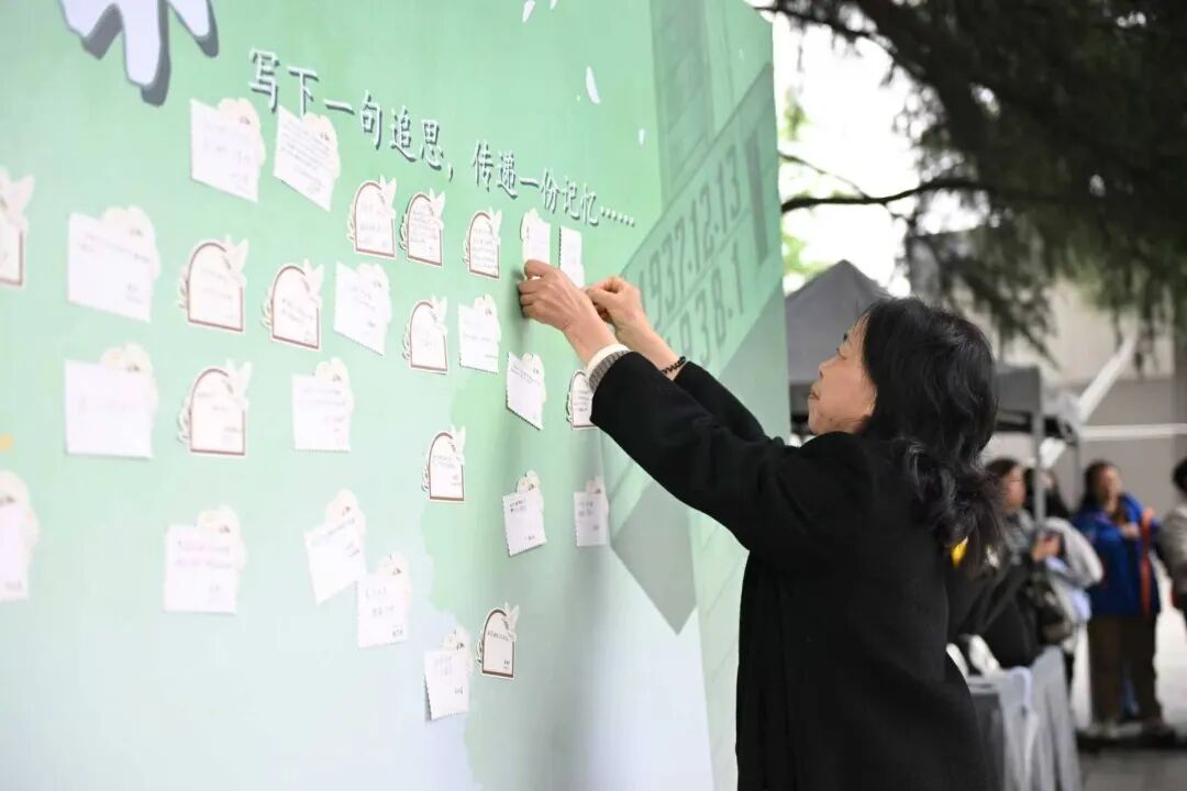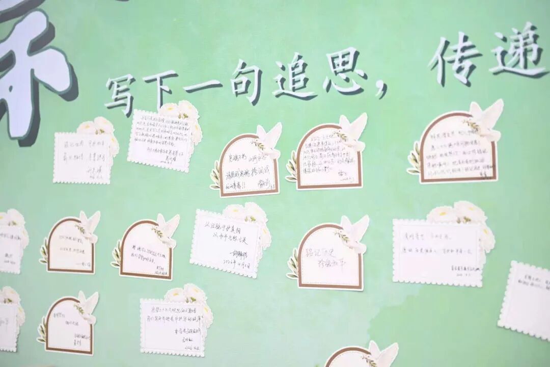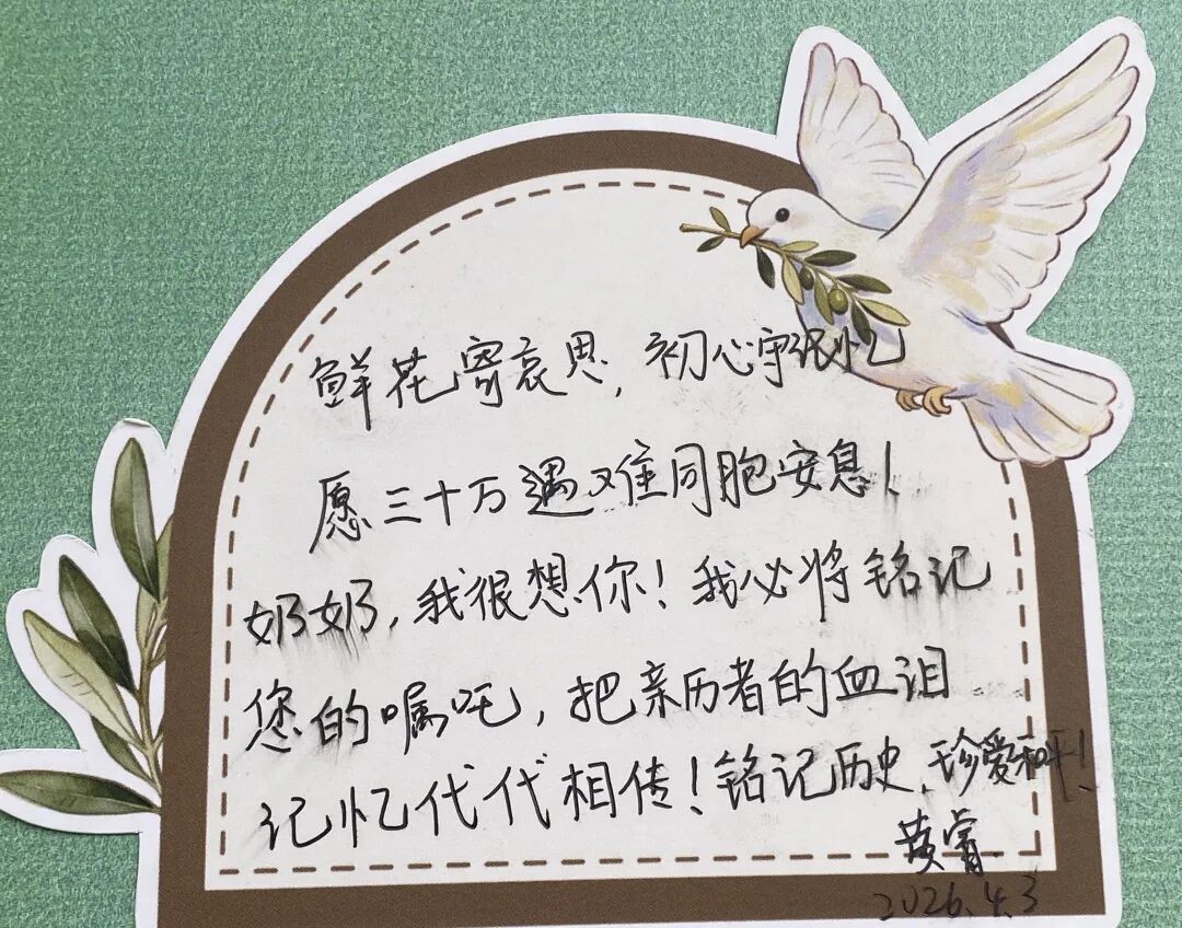 “清明在此抚今追昔”“岁月无声,历史有痕”“奶奶,我很想念您”……幸存者后代、历史记忆传承人及学生代表纷纷写下清明追思寄语,贴在追思墙上。