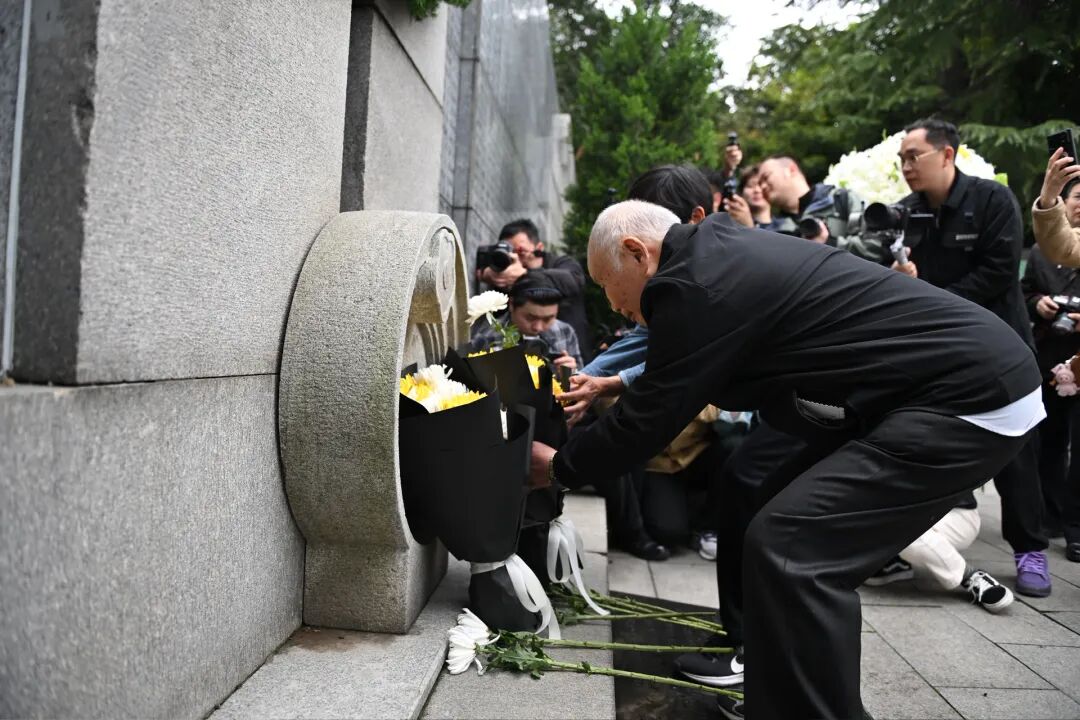 97岁的幸存者夏淑琴在家人的搀扶下,缓步走向“哭墙”。她颤巍巍地献上手中的菊花,花白的头发下,双眼满含悲戚。1937年,夏淑琴全家惨遭日军屠戮,一家9口人中7人遇难,仅她与4岁的妹妹侥幸生还,她被日本兵戳了三刀,这些伤疤成为那段血泪历史的铁证。