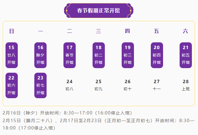 尊敬的观众朋友们:为更好地满足大家春节期间的参观需求,我馆新增除夕(2月16日)开放安排。调整后,春节假期(共9天),我馆将全程开放。