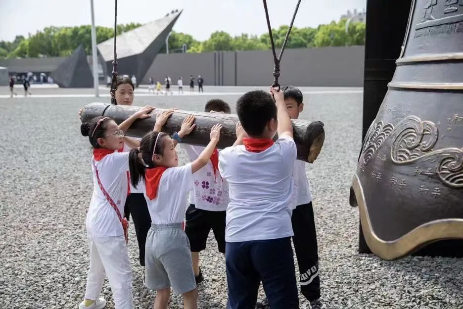 “咚,咚,咚……”在一声声雄浑的钟声中,孩子们开启了学习课程。在公祭广场上,孩子们佩戴红领巾,敲响和平大钟,在悠悠钟声中铭记历史,祈愿和平。