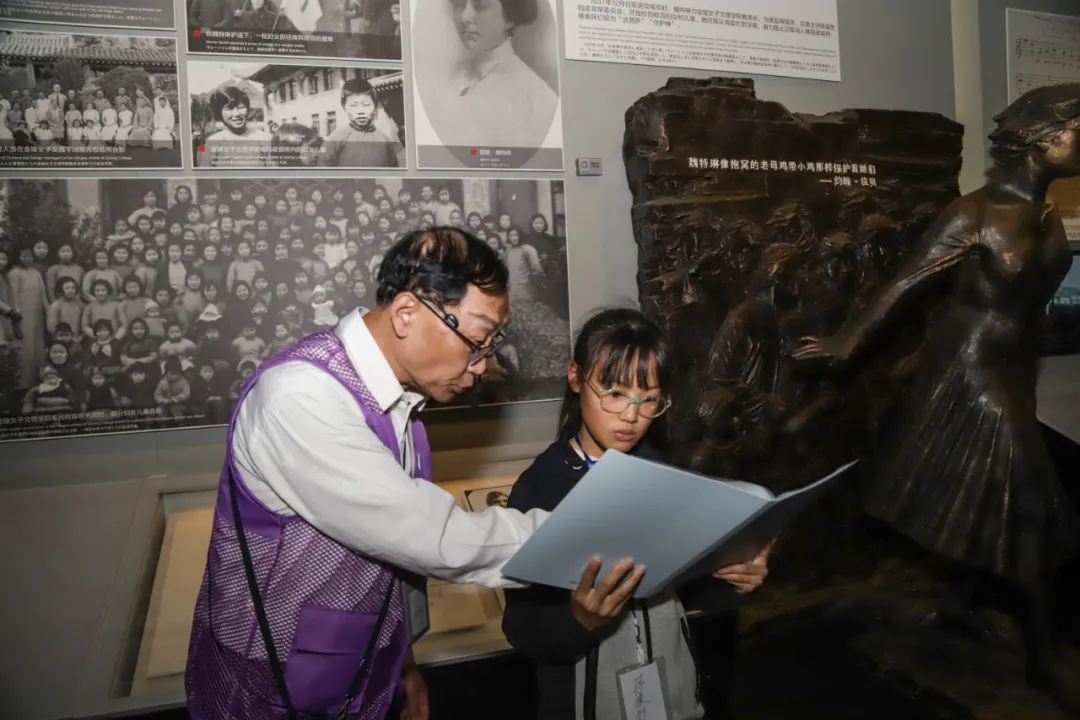 在魏特琳雕塑前,志愿者傅云生爷爷引导小学生蒋豫彤朗读《魏特琳日记》。蒋豫彤告诉小编:“我觉得日军制造南京大屠杀太残忍了。我们要好好学习,加强国防,以后再不被外人欺负。叶爷爷平常也跟我们说,要好好学习,珍惜现在的生活,长大要报效祖国。”