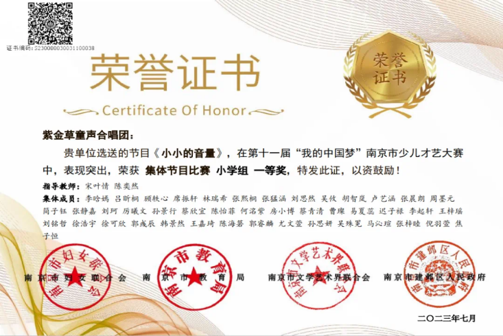 参加第十一届南京市“我的中国梦”才艺(合唱)比赛,现场演唱《小小的音量》,荣获一等奖。