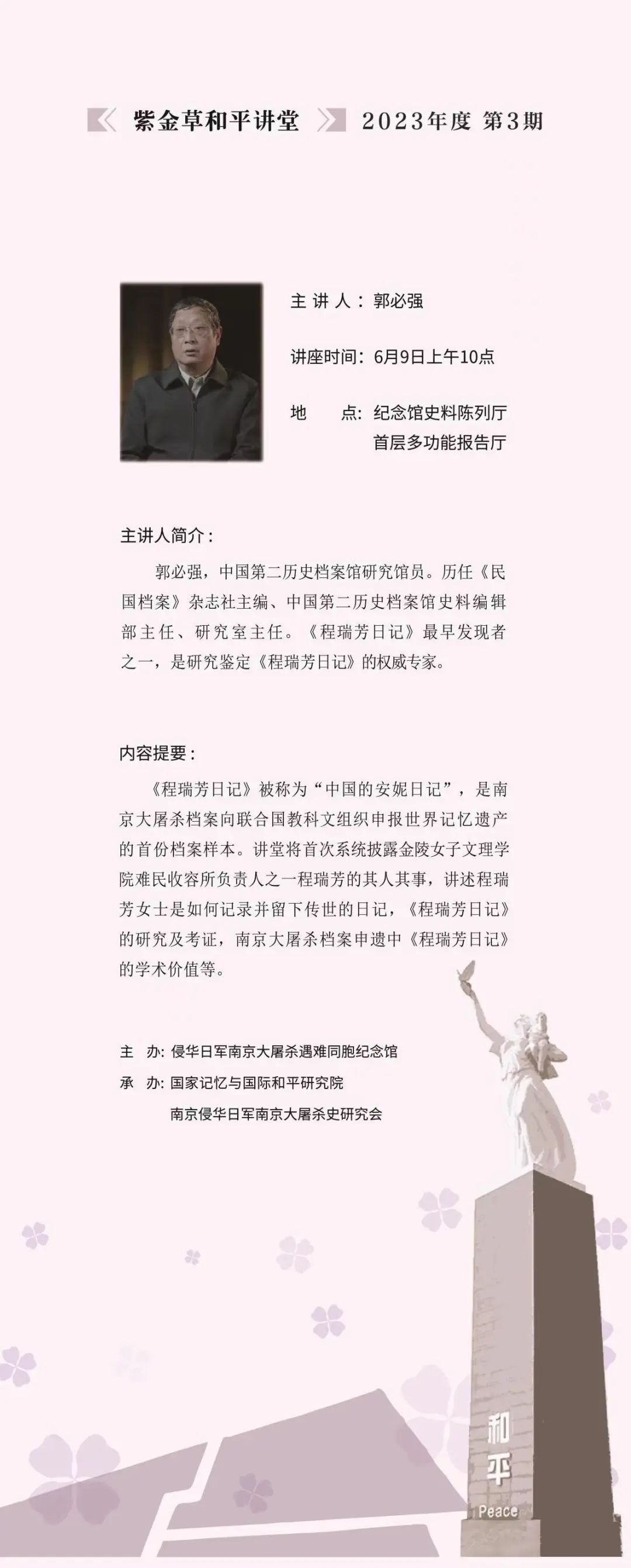 6月9日是国际档案日。我馆特邀《程瑞芳日记》发现者之一、中国第二历史档案馆研究馆员郭必强作客紫金草和平讲堂,为观众讲述《程瑞芳日记》这一南京大屠杀重要档案的发现过程和意义。