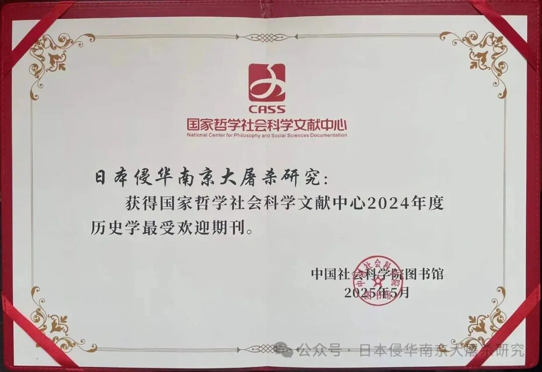 2025年5月,《国家哲学社会科学文献中心最受欢迎期刊报告(2024年度)》在京发布,《日本侵华南京大屠杀研究》杂志获“历史学最受欢迎期刊”(共五种)。