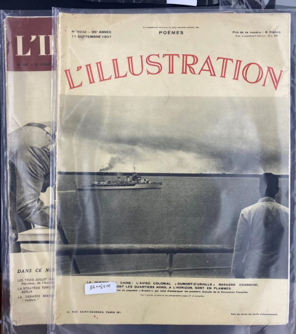 Two copies of a French newspaper, published on September 11, 1937 and July 29, 1939, respectively, showed photos of Japanese aircraft bombing the Nanjing Road in Shanghai and Chinese police searching for bodies in the debris.