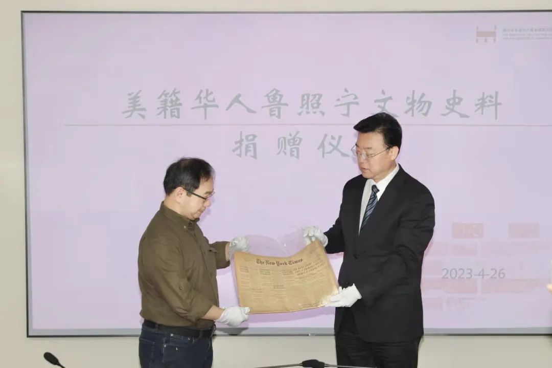 On the morning of April 26, a Chinese-American named Lu Zhaoning came to the Memorial Hall of the Nanjing Massacre Victims by Japanese Invaders and donated 98 items of overseas historical materials related to the Nanjing Massacre, including a soldier’s document and The New York Times newspapers.