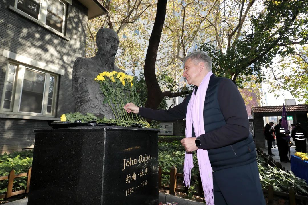 Oliver Giersberg, senior vice president and chief operation officer of BSH Home Appliances Group Greater China region,places a flower at the statue of John Rabe to show respect
