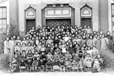 A group photo of some women and children taking shelter in Jinling Women’s College of Arts and Sciences