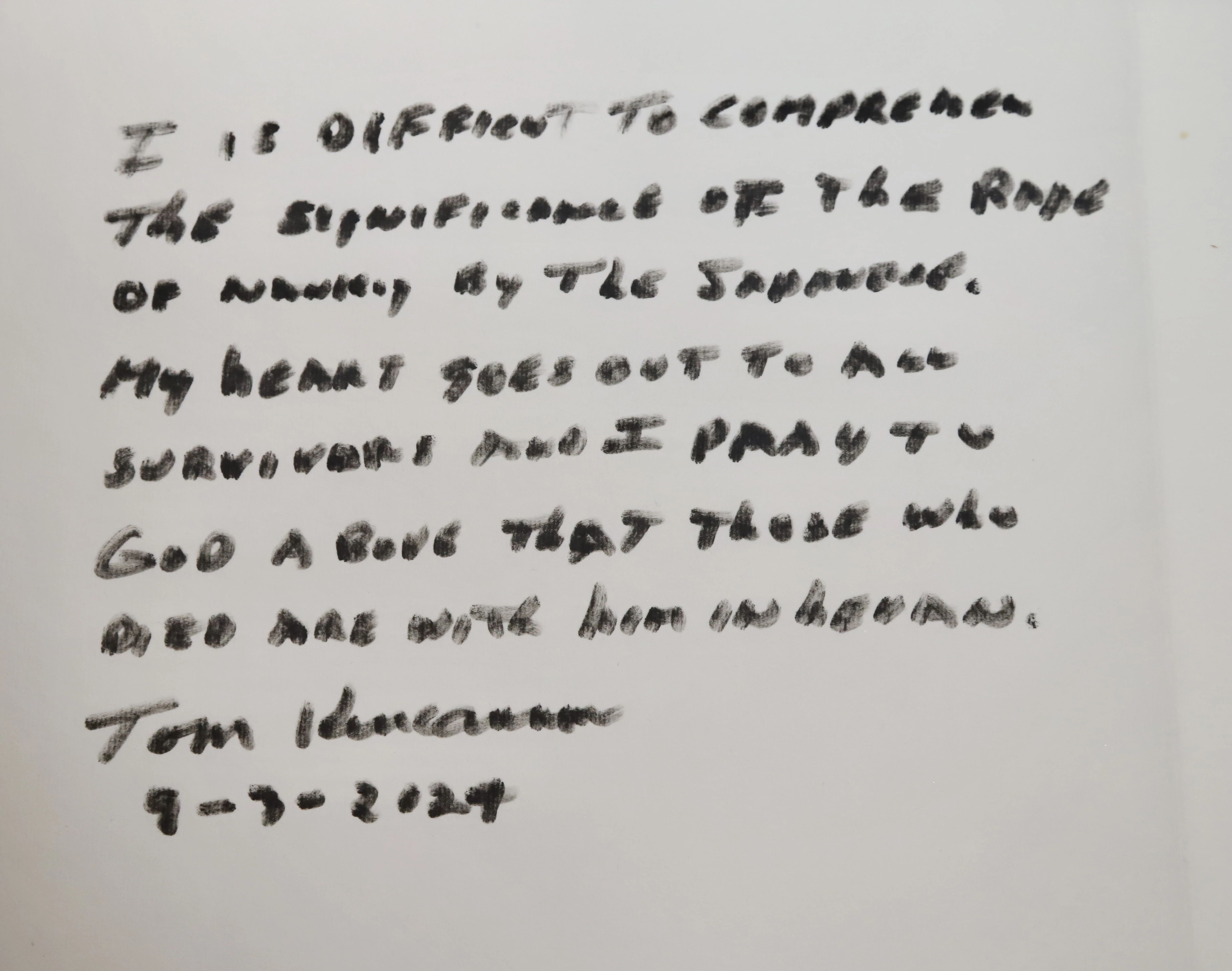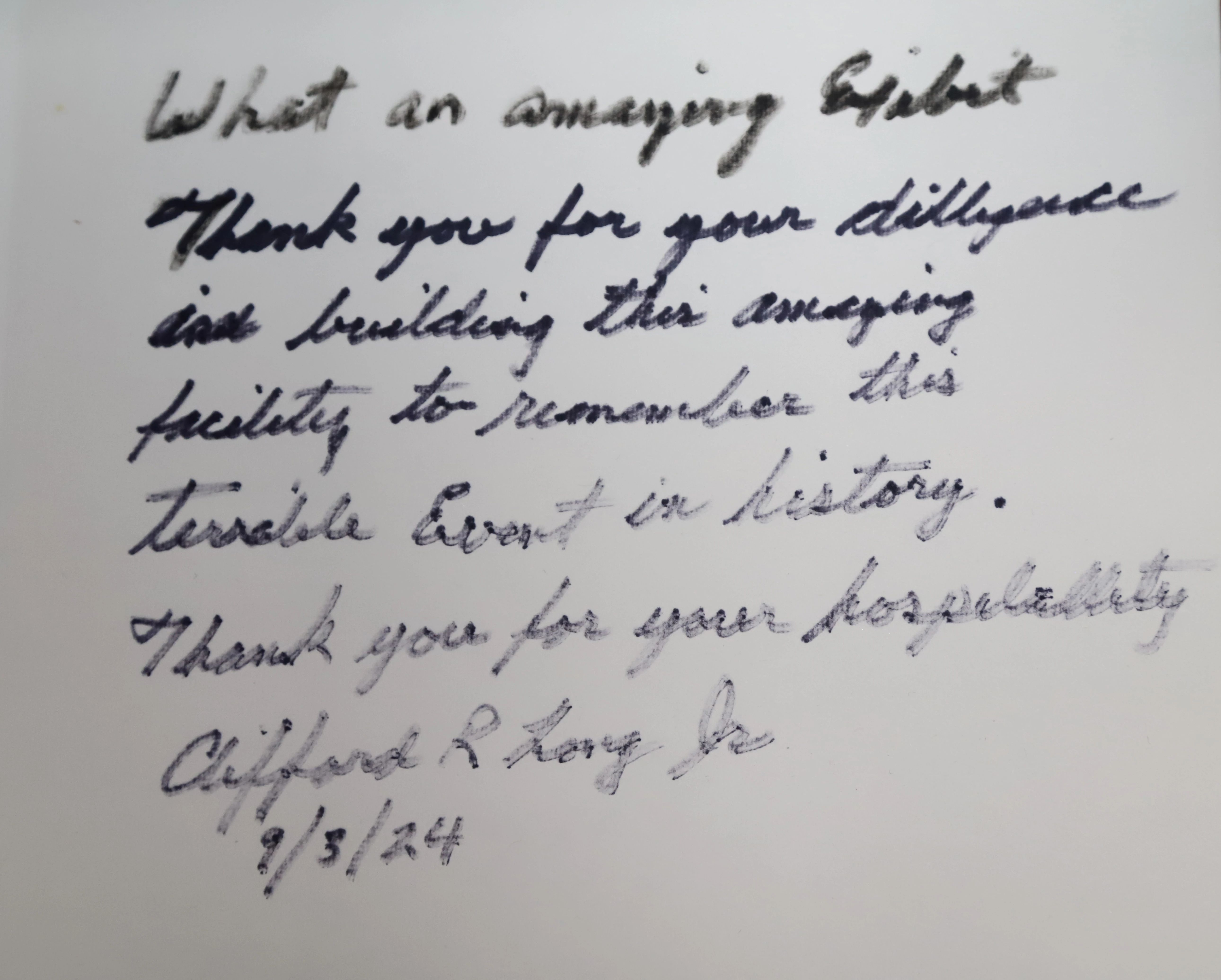 Clifford R Long, Vice Chairman of the Sino-American Aviation Heritage Foundation and son of a Flying Tigers 14th Air Force P-40 pilot, wrote: “What an amazing exhibit! Thank you for your diligence in building this incredible facility to honor this terrible event in history. Thank you for your hospitality.”