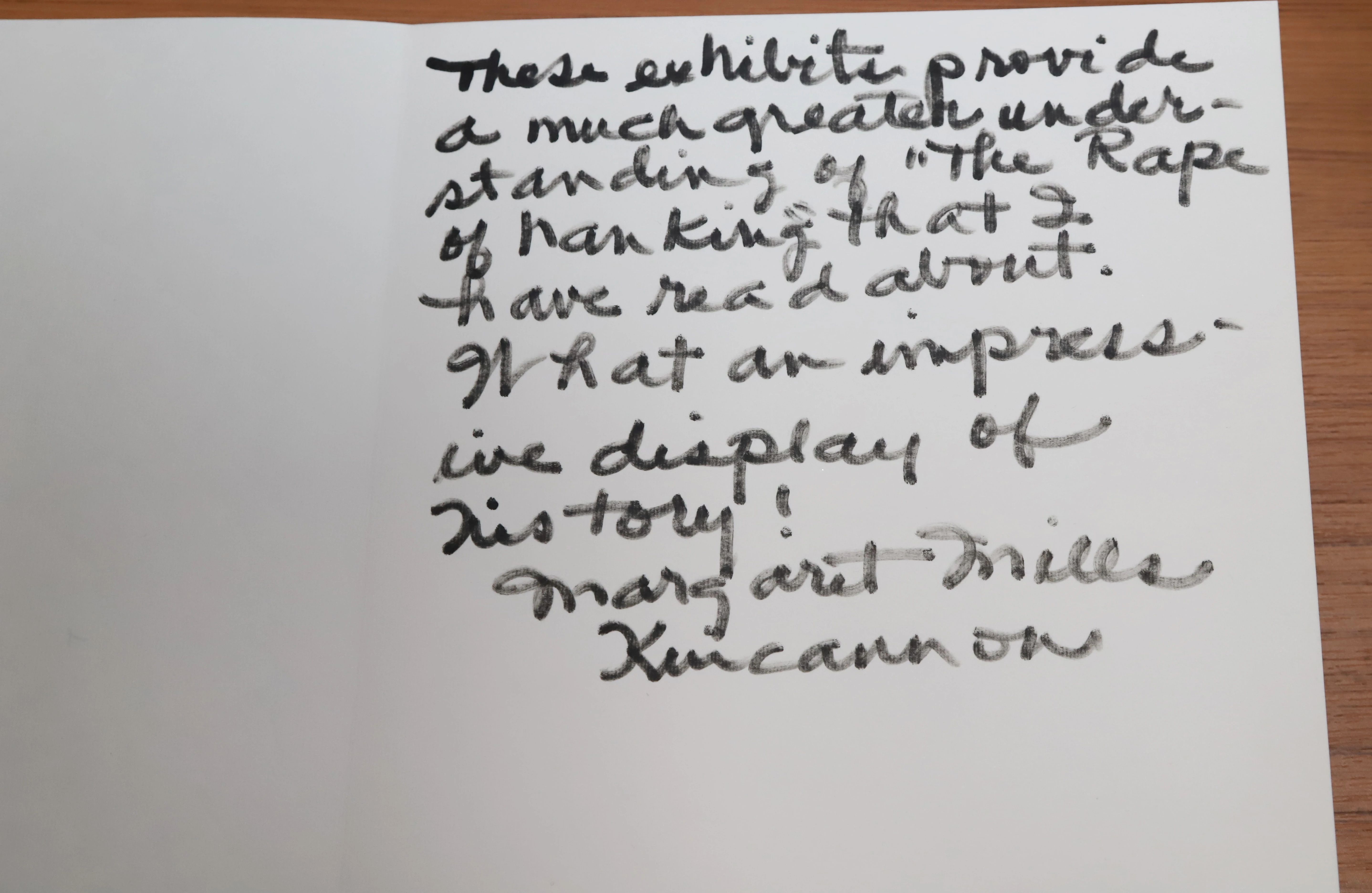 Tom Kincannon, Margaret’s husband and a former U.S. Navy sailor who serves as an advisor to the Sino-American Aviation Heritage Foundation, had read reports about the Nanjing Massacre before his visit but often felt unsettled by them. He was grateful for all the efforts made by the Memorial Hall and also hoped to contribute in some way. He wrote: “It is difficult to comprehend the significance of the ‘The Rape of Nanking’ by the Japanese. My heart goes out to all survivors.” Margaret wrote: “These exhibits provide a much great understanding of “The Rape of Nanking” that I have heard about. What an impressive display of history!