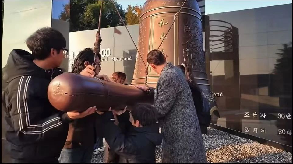 Evan Kail, an American young man, along with 11 other visitors in two groups, rang the Bell of Peace 13 times, symbolizing the remembrance of a significant date – December 13, 1937.