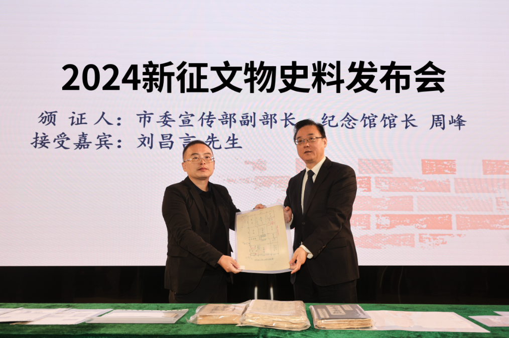 Donor Liu Changyan is handing over thecollection of cultural relics and historical materials to Zhou Feng, Director of the Memorial Hall
