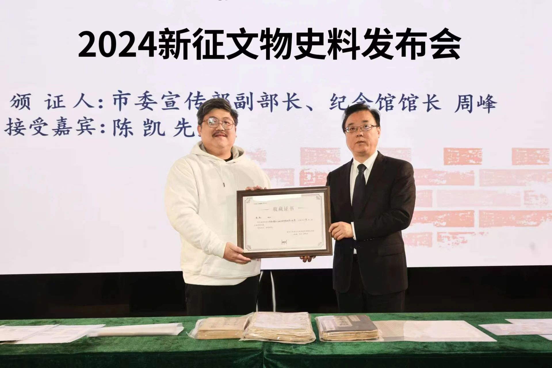 Zhou Feng, Director of the Memorial Hall, is presenting the collection certificate to the Donor Chen Kai