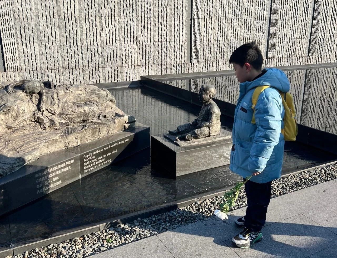 Mr. Xing and Ms. Guo from Chongqing visited Nanjing for an independent Spring Festival trip. After attending the Bell Ringing Ceremony at 8:30 am, they visited the exhibition hall for nearly two hours. They shared that the exhibition left them with a heavy heart, reminding them of China's difficult past. Stepping outside and seeing the blue sky and white clouds again, they deeply appreciated how fortunate and happy they are to live in today's China.