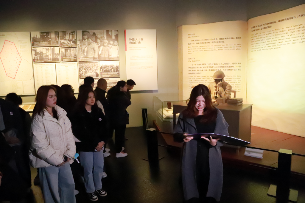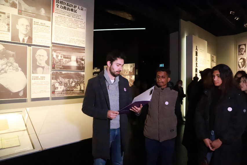 In the "Humanitarian Relief" section of the exhibit hall, Fernando from Spain read excerpts from The Diaries of Wilson. He is currently studying at the College of Overseas Education of Nanjing Tech University, and this is his first time volunteering at the Memorial Hall.