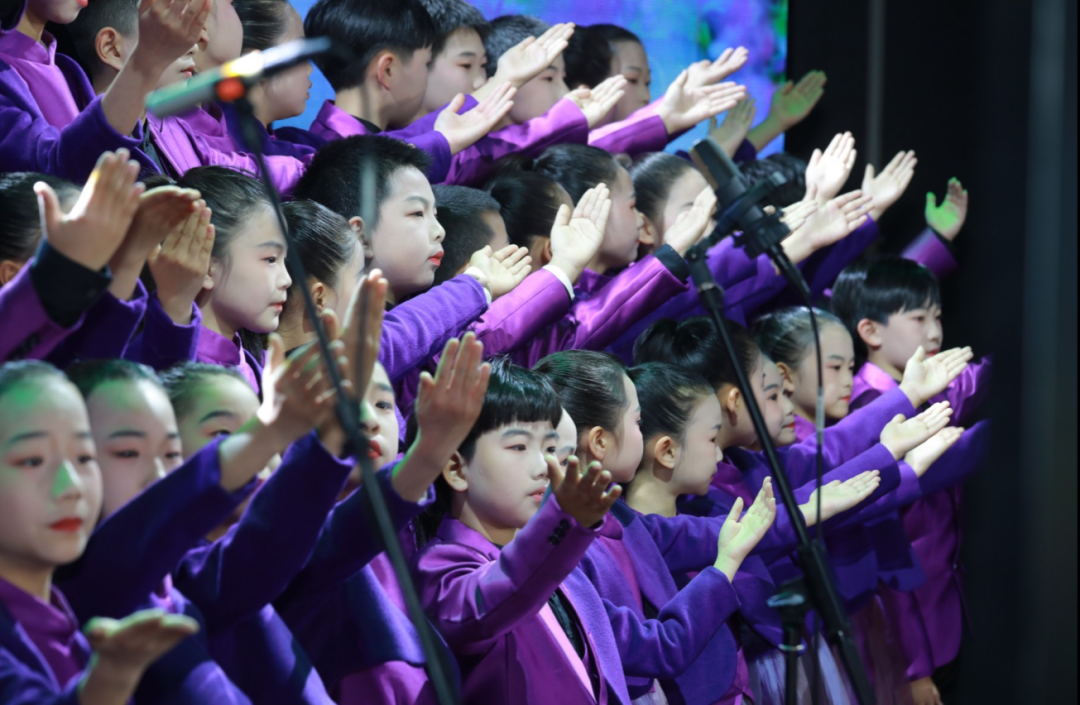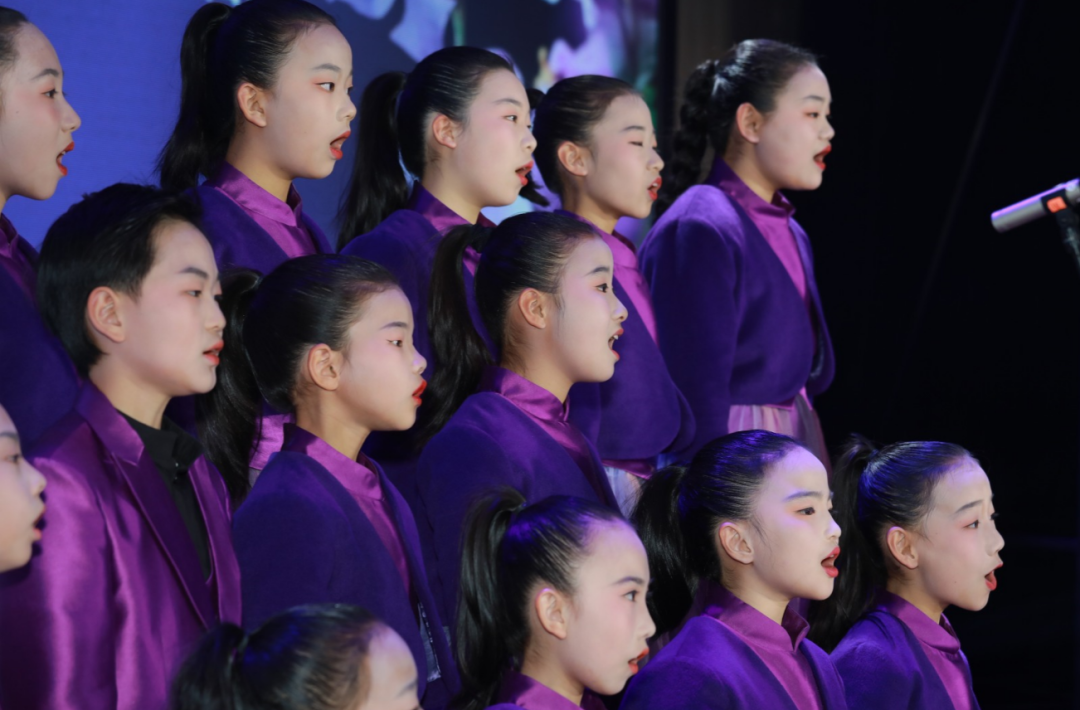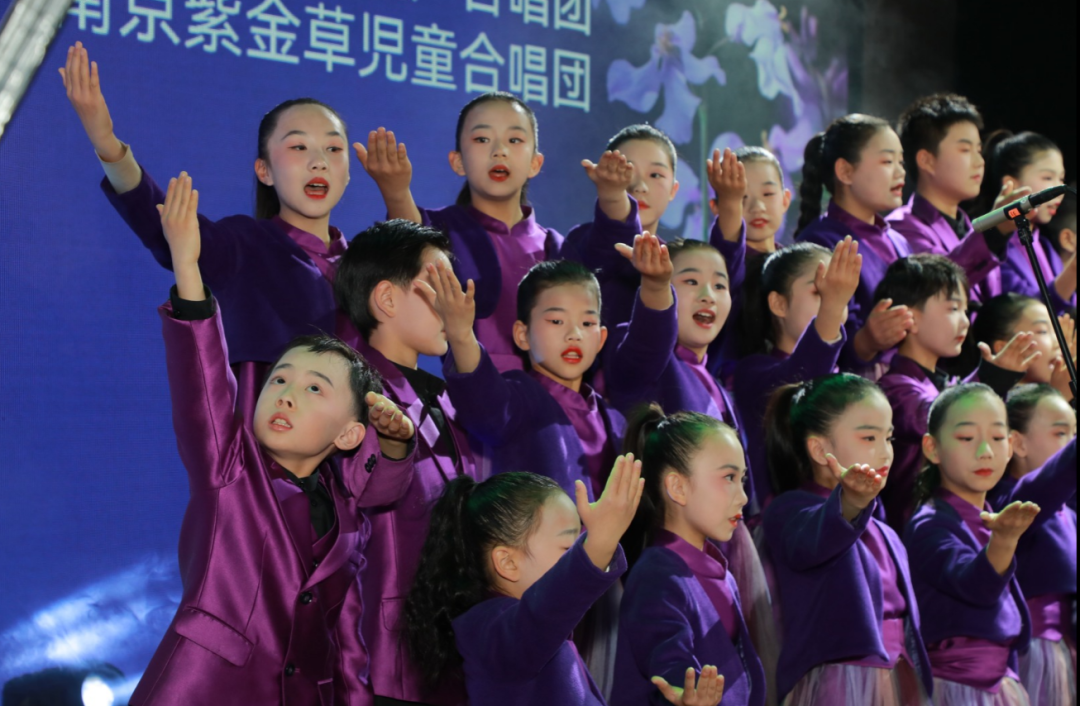 The children of the Nanjing Zijin Grass Children's Choir are dressed in purple gowns, their faces glowing with vibrant smiles, and their small hands gently swaying to the melody.With their clear voices and youthful energy, they perform songs like "Peace Blows Over Zijin Grass," "Red Dragonfly," and "The Peaceful Children's Song." Their singing is like the sunlight of spring, warm and full of hope.