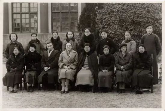 Staff and workers of the refugee camp at Ginling Women's College of Liberal Arts and Sciences, with Minnie Vautrin sitting fourth from the left in the front row and Cheng Ruifang fifth from the left