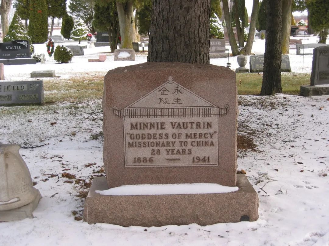 The American Board of Commissioners for Foreign Missions declared in the obituary: "Like a soldier who fell on the battlefield, Minnie Vautrin was also a casualty of war." Vautrin's suicide was primarily caused by severe depression, one of the significant triggers of which was the trauma inflicted by the Japanese military's atrocities in Nanjing. Japanese scholar Kano Jiro pointed out: "It was the Japanese military's attack and occupation of Nanjing that caused Minnie Vautrin's mental breakdown and subsequent suicide... She was one of the victims of the Japanese invasion of China."On May 18, in the suburbs of Shepherd, Michigan, USA, a solemn and dignified funeral was jointly held for Vautrin by the Missionary Union and the American Board of Trustees of Ginling Women's College of Liberal Arts and Sciences. On the front of her rectangular tombstone, an architectural section of Jinling Women's College is engraved. Within the gable roof, four Chinese characters are inscribed vertically in strong and elegant Clerical script: "Eternal Jinling."