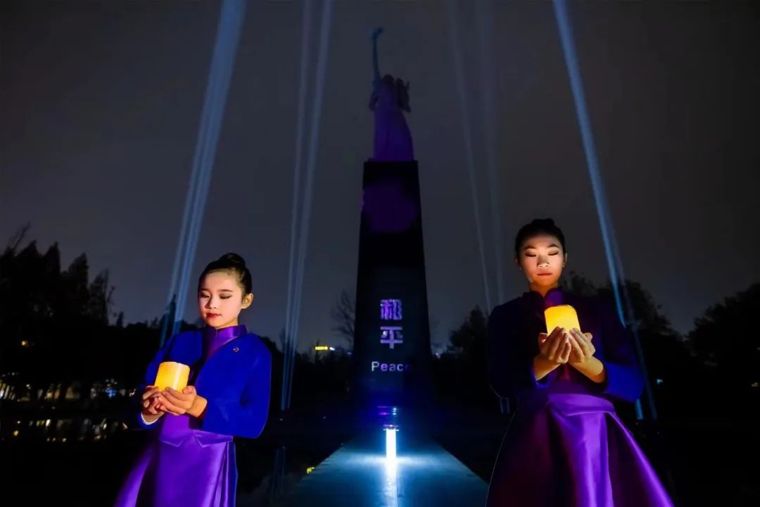 和平的力量犹如点点烛光,微光成炬,积少成多。在纪念馆和平广场,紫金草女孩手捧发光灯箱,缓缓走向和平广场。道路旁的60多个孩子守护着。发光灯箱从一个孩子传递给一个外籍人士,再传递给南京大屠杀幸存者葛道荣的重孙女葛芊影……灯箱最终被传递到和平广场,放置于和平女神像下。瞬间,四束象征和平之光的紫色灯柱从和平女神像四角直射天空,寓意和平之路需要每个人守护。