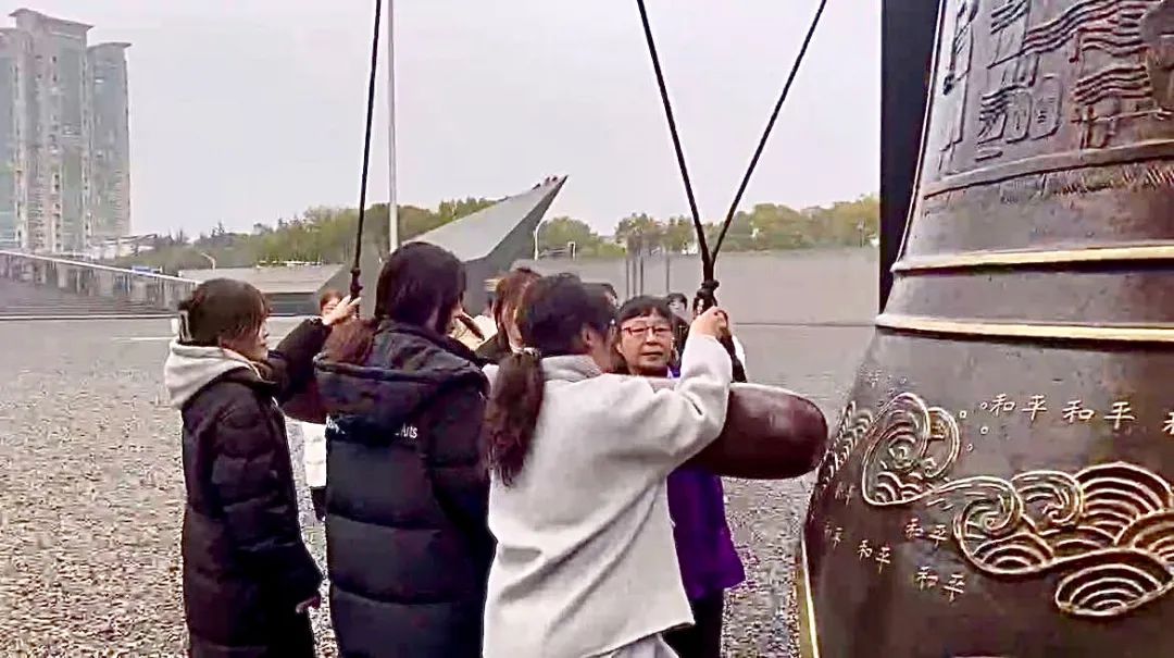 今天上午,撞响和平大钟仪式在纪念馆公祭广场举行。第一批进馆的观众代表与紫金草志愿者代表共同参加仪式化教育活动。