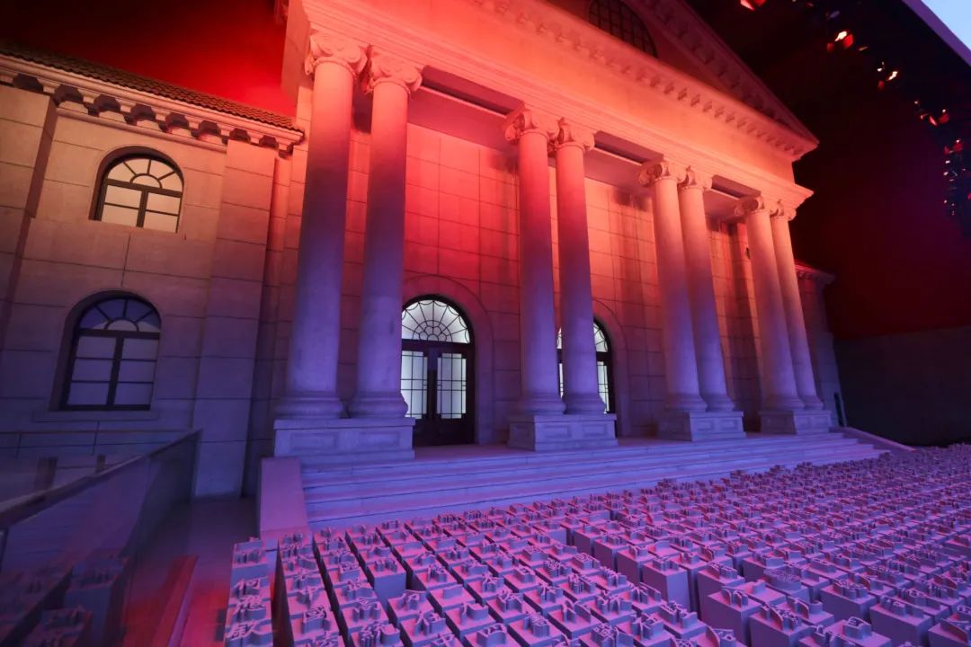这里按照1:1的比例复原了当年南京举行受降仪式的地点——中央陆军总部大礼堂外景。礼堂前采用阵列呈现的手法,立体化显示了891个字的《降书》,全方位展现重要的历史时刻。