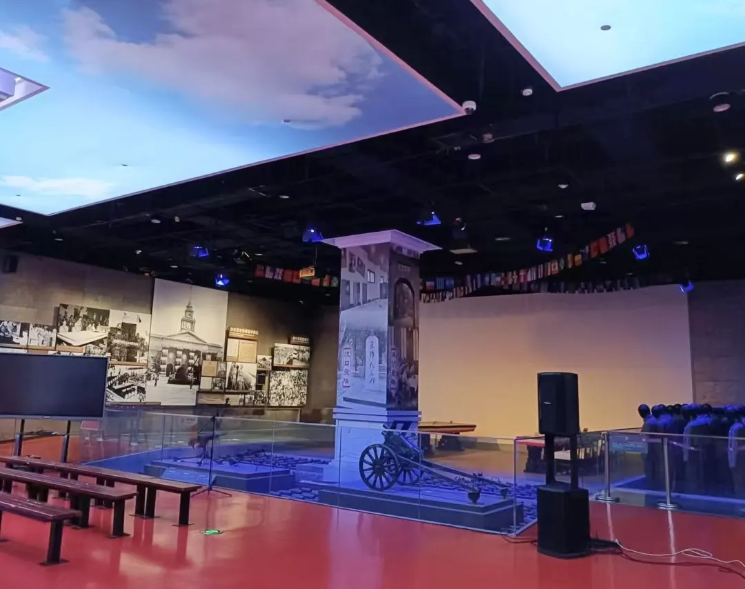 场景上方悬挂着当时来南京参加受降仪式的47个盟国的旗帜,周边展出了缴获的日军武器装备,以及穿着军服列队投降的日军官兵塑像。