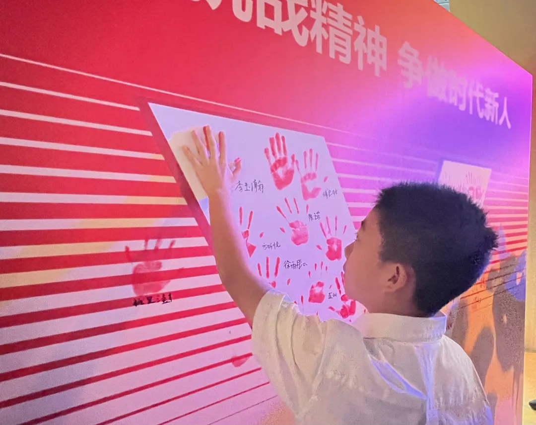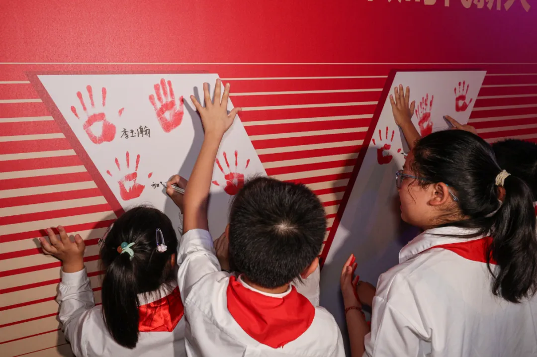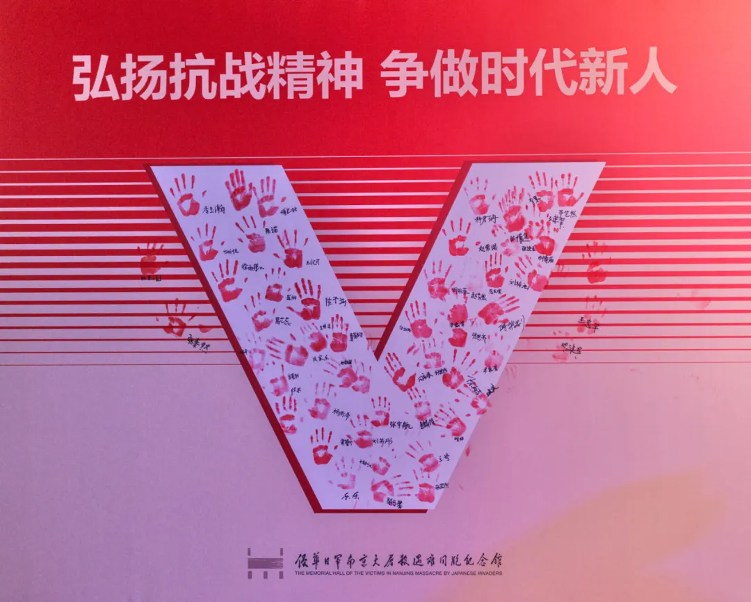 活动尾声,全体人员来到尾厅的抗战老兵手印墙前,在代表胜利的巨幅“V”字型主题展板上按下了各自的手印并签名。这些手印共同汇集成一幅大型的“V”字型,勉励大家弘扬抗战精神,争做堪当民族复兴重任的时代新人。
