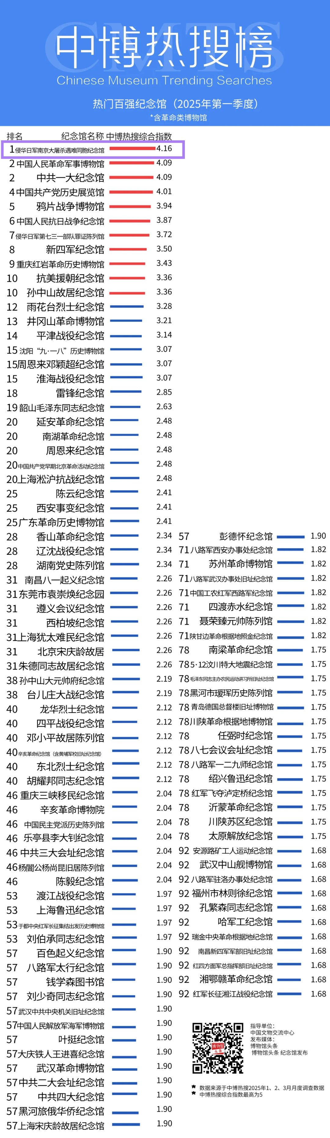 4月12日,备受文博圈关注的“中博热搜榜”公布2025年第一季度全国“热门百强纪念馆”榜单,我馆位列第一!