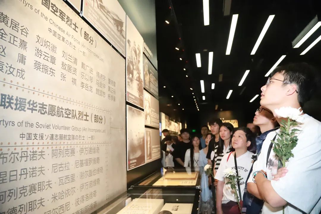 观众驻足在我馆“三个必胜”展厅中介绍苏联援华志愿航空队的展板前观看