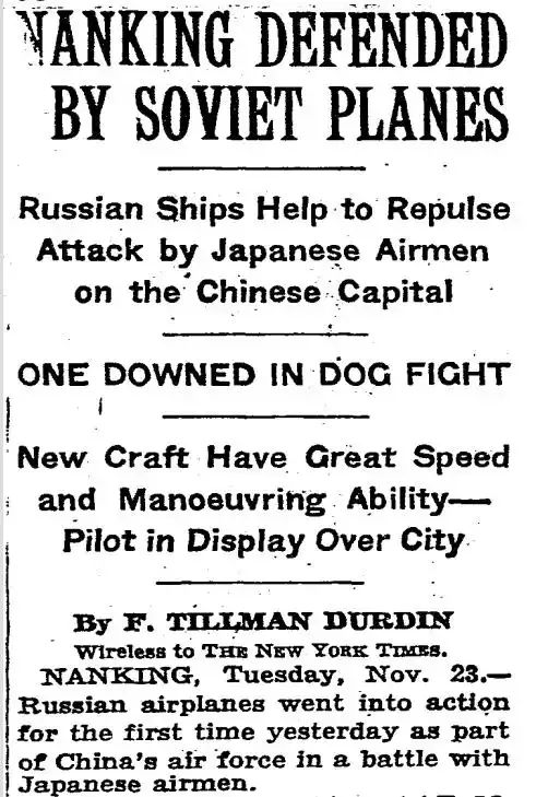 《纽约时报》报道《苏联飞机保卫南京》
