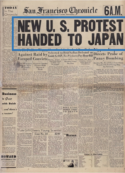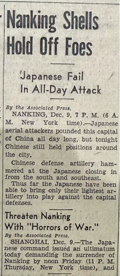 1937年12月9日《纽约世界电讯》头版报道:“9日晚上7点——日军空袭部队对中国首都进行了一整天的轰炸,但今晚中国军队仍坚守在南京城周边阵地。中国防御炮火对从南面和东南面逼近的日军进行了猛烈炮击……日军司令部今日发出最后通牒,要求南京在周五中午前投降。”