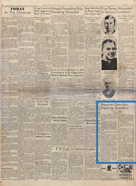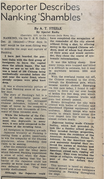 1937年12月18日《旧金山纪事》第2版特稿,转载《芝加哥每日新闻》驻华记者阿契包德·斯蒂尔1937年12月15日从美国军舰“瓦胡”号发往美国的报道:“我们离开这座城市时,最后看到的一幕是,300名中国人在江堤附近被有计划地处决,此前这里的尸体已堆积到齐膝深……这是过去几天南京惨状的典型写照。”
