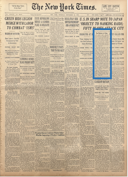 1937年9月23日《纽约时报》头版报道称:“昨天,50架日本飞机对南京进行了长达数小时的两轮空袭。在最后一枚炸弹落下后,超过200名平民伤亡。”