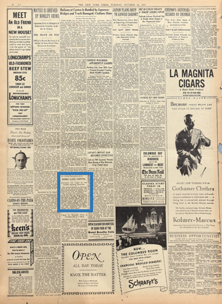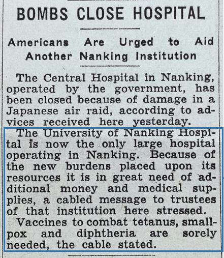 1937年10月12日《纽约时报》第2版报道:“目前,金陵大学医院是南京唯一仍在运营的大型医院。由于资源面临新的压力,该院急需额外资金和医疗物资。致该机构托管人的电报着重强调了这一点。电报称,急需用于防治破伤风、天花和白喉的疫苗。”