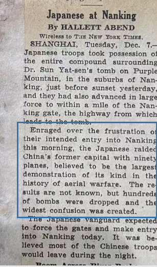 1937年12月7日,日军逼近南京城。当天,《纽约时报》头版报道:“因未能按计划今早进入南京城,愤怒的日军出动了90架飞机,据信这是有史以来规模最大的空袭。不过,空袭结果尚不明了。数百枚炸弹投下,造成了极大混乱……”
