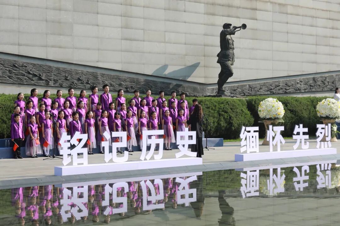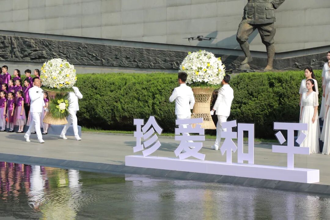 号角声落,全场肃立,《中华人民共和国国歌》奏响,人们齐声高唱。随后,纪念馆向抗日英烈敬献花篮。
