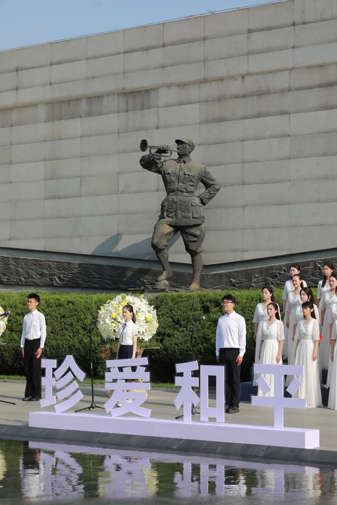 在象征正义与胜利的“V字”浮雕墙前,“铭记历史、缅怀先烈、珍爱和平、开创未来”16个主题浮雕字熠熠生辉。朝阳下,4名小号手昂首挺胸,吹响《胜利号角》。硝烟虽已远去,胜利的号角仍在回响。人们驻足肃立,在号角声中再次回望14年艰苦卓绝的抗战岁月。